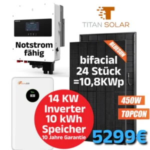Nr. 1452 10kW PV Photovoltaik Set Solar Set mit 10,8kW bifaziale Module, 10 kW Hybrid Wechselrichter mit Notstrom und 10,2kWh Speicher