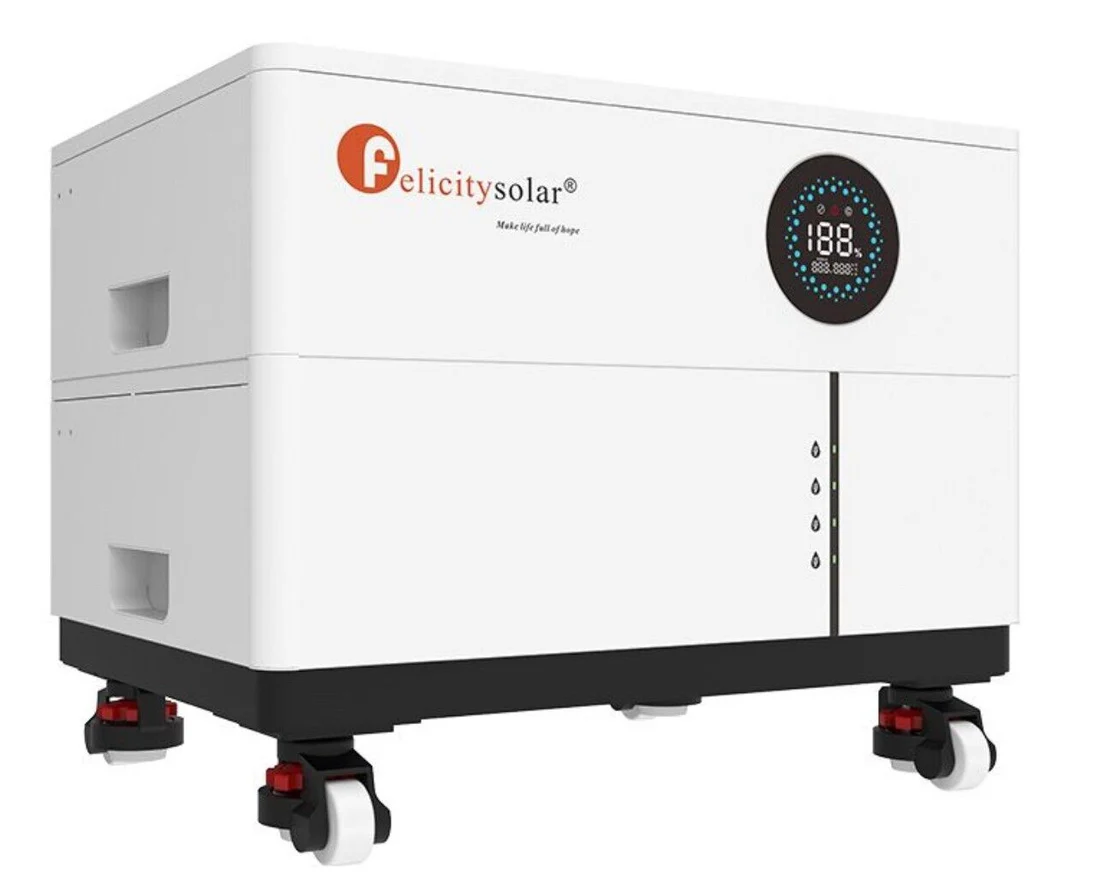PV Speicher Felicity Stapelspeicher. Hier als 10,24 kWh Variante (Art. 1565 + Art. 1566) mit eingebautem BMS und Rollen. Kann mit weiteren 5.12kWh Modulen Artikel Nr. 1566 auf bis zu 42,5kWh erweitert werden. Die Elemente werden einfach gestapelt und bekommen dabei ihre Verbindungen über ein Stecksystem.