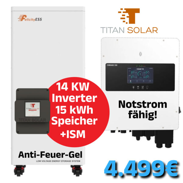 Titan Solar Chisage Mars 14kW Wechselrichter im Set mit Titan Solar ISM Computer und Titan Solar Felicity Rollenspeicher 15kWh mit Anti-Feuer-Gel und Wifi.